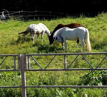 Hochwertiges Heu ad. lib., eine ausreichend große überdachte Liegefläche für alle Pferde, ein auch bei Dauerregen matschfreier ganzjährig 24/7 zugänglicher Paddock mit massiver Umzäunung, ausreichende Koppelfläche, kurze Wege für uns, keine Engstellen für die Pferde. Und eine stabile Pferdegruppe ohne Wechsel, was im gewerblichen Bereich oder auch bei größeren privaten Stallgemeinschaften kaum zu vermeiden ist und Pferde in einer Zusammenstellung, die auch ein gemeinsames Futtermanagement möglich macht. Heu gibt es aus einer Glocke. Vorteil: Tiefe Fressposition, rund, einfach zu befüllen und sauber zu halten. Die Glocke hat fünf Fressstellen, trotzdem zeigte sich, dass es sinnvoll ist an einer tatsächlich räumlich getrennten Stelle eine zweite Futterstelle einzurichten. Am anderen Ende des Stalles hängt daher ein Heunetz. Wasser bieten wir aus einem Bottich an, isoliert und im Winter elektrisch beheizbar.