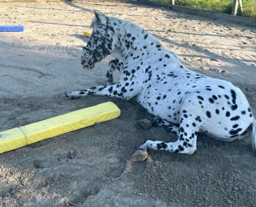 Magic wurde in der Reitpause von unbestimmter Dauer durch Equikinetik, Dualaktivierung, allgemeine Bodenarbeit und Freiarbeit in reitbarer Form gehalten. Unabhängig davon, ob er wieder geritten werden kann, war es mir wichtig, dass er kein Berufsunfähigkeitsrentner wird und abbaut; ein Pferd wieder aufzubauen ist schwieriger wie den Status zu halten.